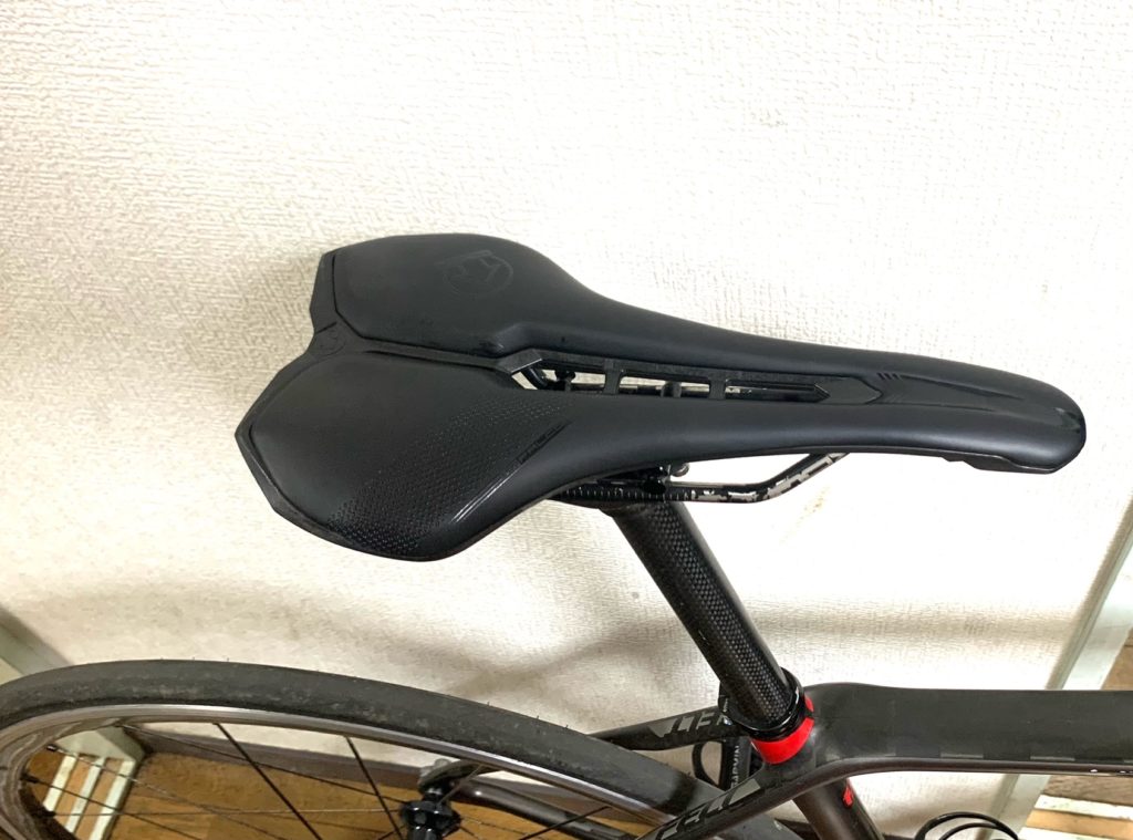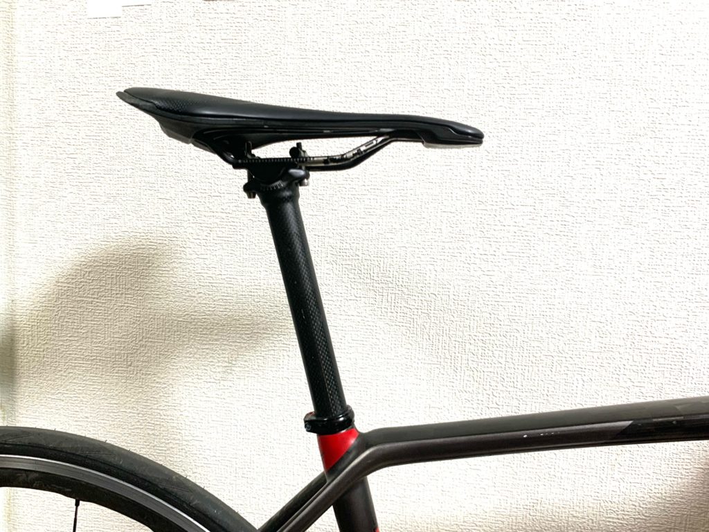 ジオメトリーの関係上3cmセットバックが限界で、使用しているサドルは通常のタイプ。シートポストは0オフセット。